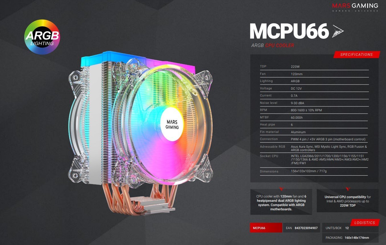 Mars Gaming MCPU66 CPU Cooler ARGB 220W Dual Fan 120mm